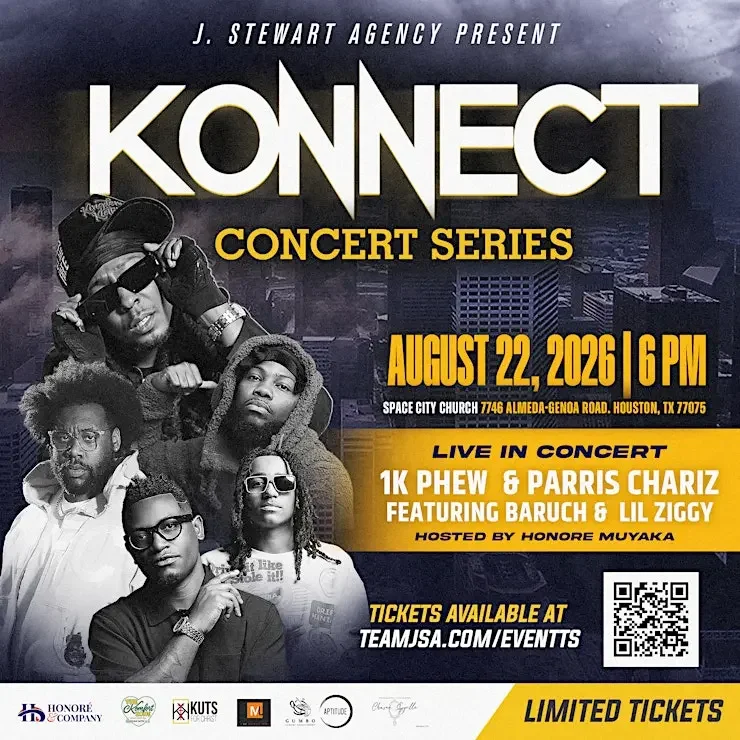 Back to All Events Konnect Concert Series Saturday, August 22, 2026 6:00 AM 9:00 PM Space City Church 7746 Almeda-Genoa Road Houston, TX, 77075 United States (map) Google Calendar ICS Get Tickets Get Tickets